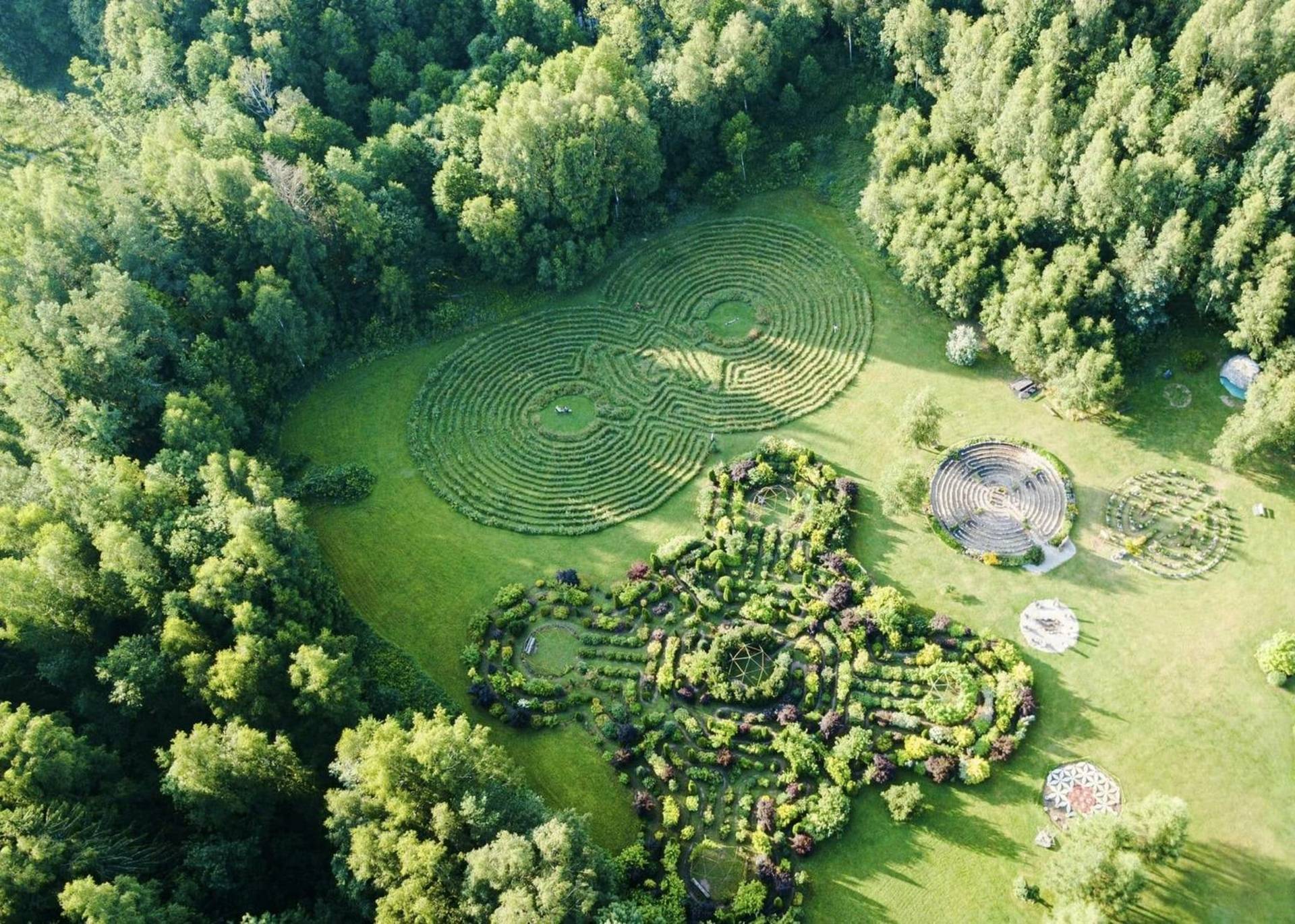 Šiame parke rasite keturis labirintus, tris kupolus, merkabą ir ant žemės sukurtą mandalą. Labirintai egzistavo jau prieš 4000 metų ir yra rasti beveik visose pagrindinėse religijų tradicijose visame pasaulyje. Kaip ir piramidės, taip ir labirintai, yra padaryti iš geometrinių formų, kurios ir sukuria šventą erdvę. Energetiniai labirintai turi tik vieną taką, vedantį į centrą ir vėl atgal. Kai žmogus keičia ėjimo kryptį, taip pat keičiasi ir jo suvokimas iš dešiniojo smegenų pusrutulio į kairijį. Tai yra viena iš priežasčių, kodėl labirintas gali skatinti suvokimo, jutimo, sąmoningumo imlumą.
