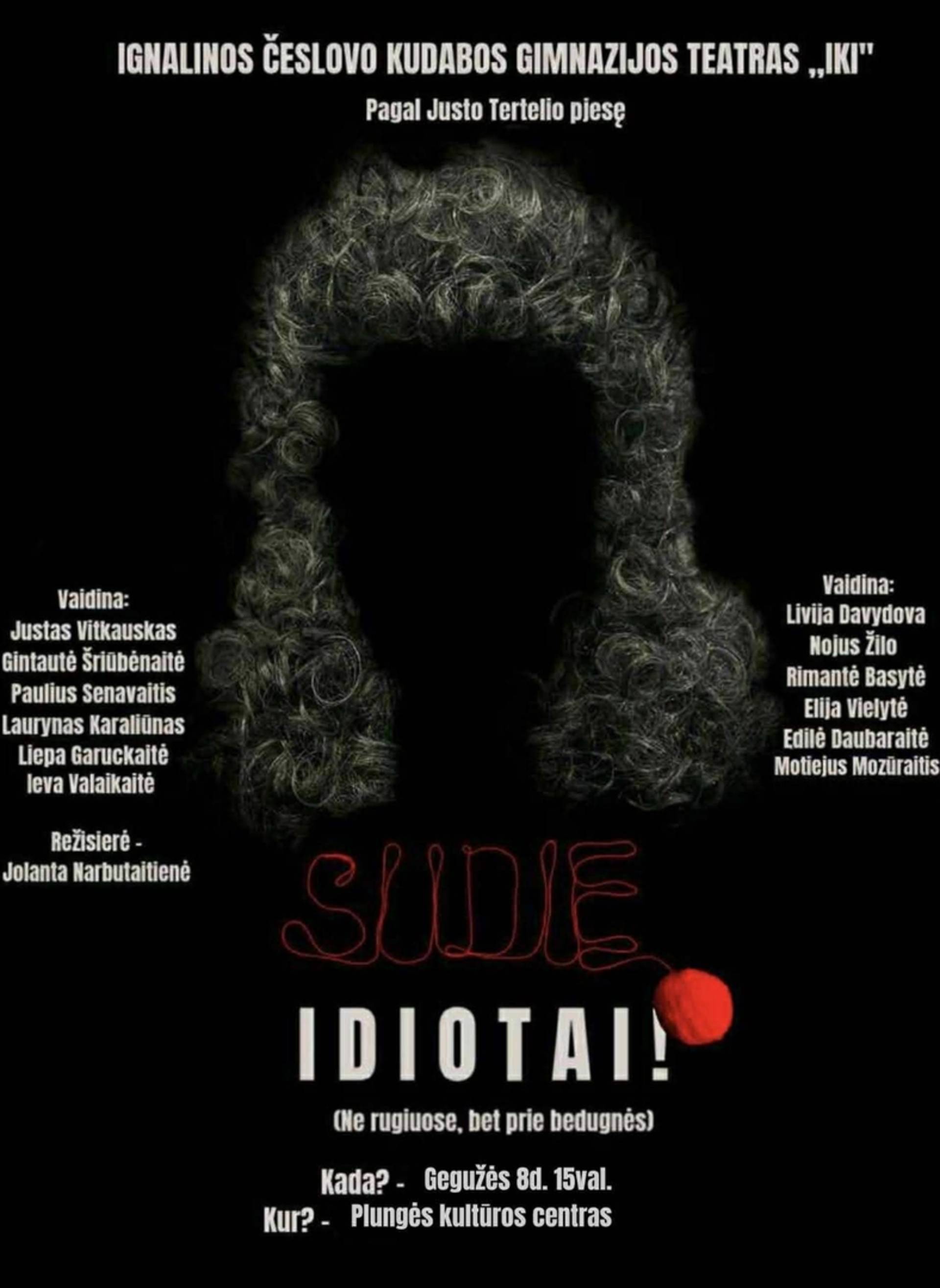 GEGUŽĖS 8 d., 15.00 val. Ignalinos Česlovo Kudabos gimnazijos teatro „IKI“ (Lietuva, Ignalina) spektaklis „Sudie, idiotai!“ (N-12). Režisierė Jolanta Narbutaitienė. Spektaklio trukmė 60 min. Spektaklis bus rodomas lietuvių kalba. Nemokamus kvietimus kviečiame rezervuotis Plungės kultūros centro kasoje (I-V 15.00-18.00 val. Tel. Nr. +37044855546).