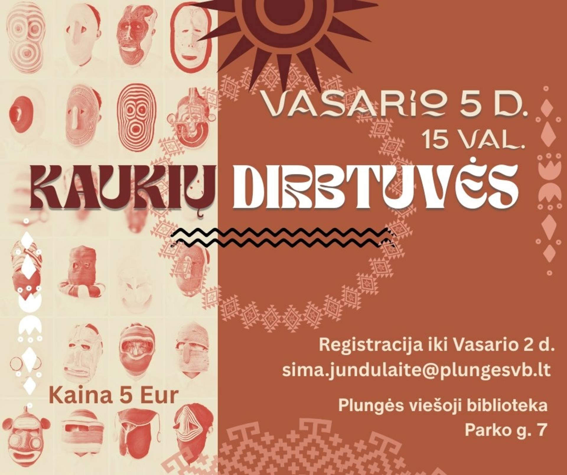 Plungės savivaldybės bibliotea kviečia ruoštis Užgavėnėms kartu - gaminsite kaukes papje mašė technika. Trumpai apžvelgsite kaukių ir karnavalų tradicijas pasaulyje, o po to lipdysite savo kaukes.