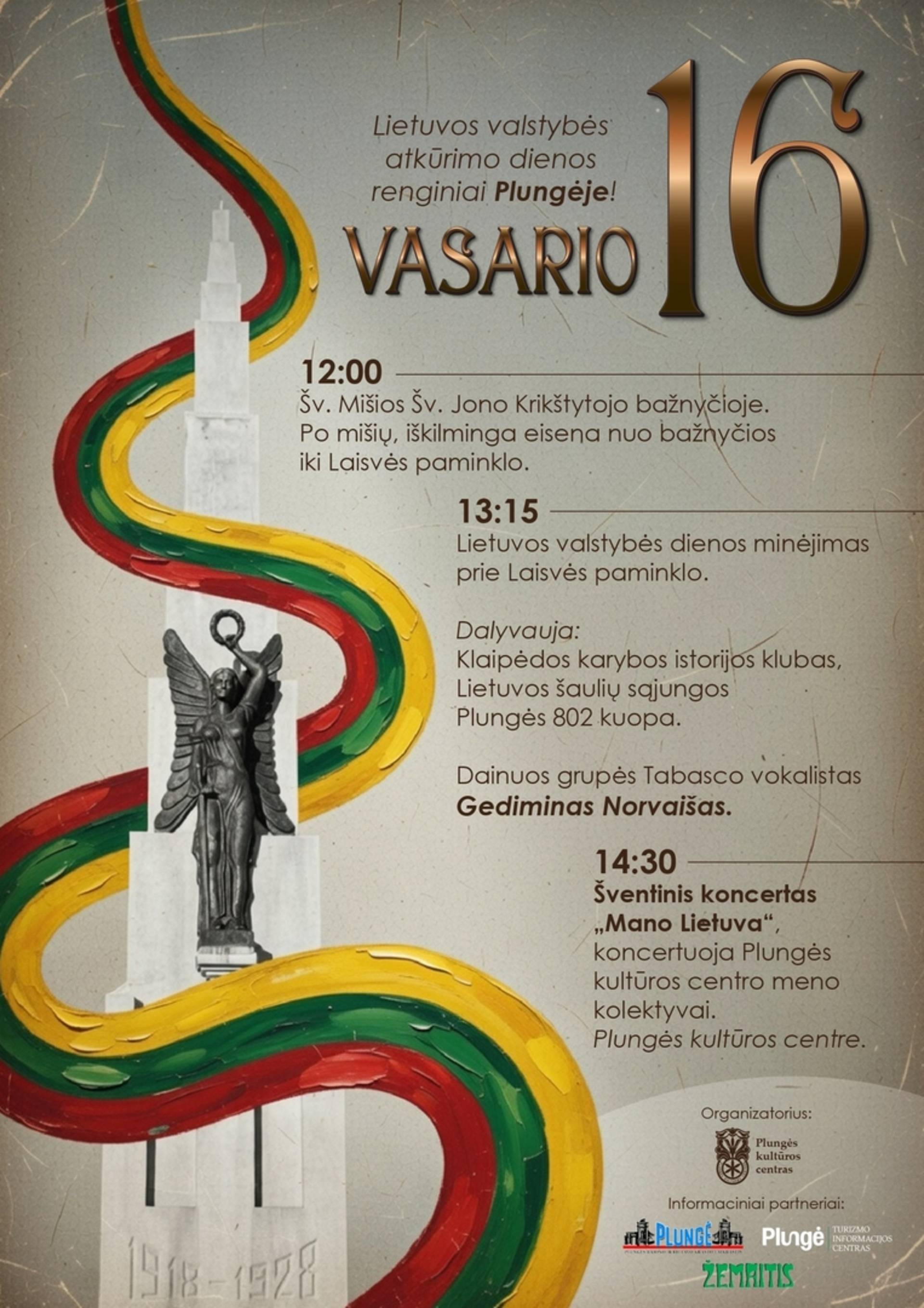 Vasario 16-ąją kviečiame Plungės miesto bendruomenę kartu paminėti Lietuvos valstybės atkūrimo dieną ir pagerbti mūsų laisvės istoriją!
