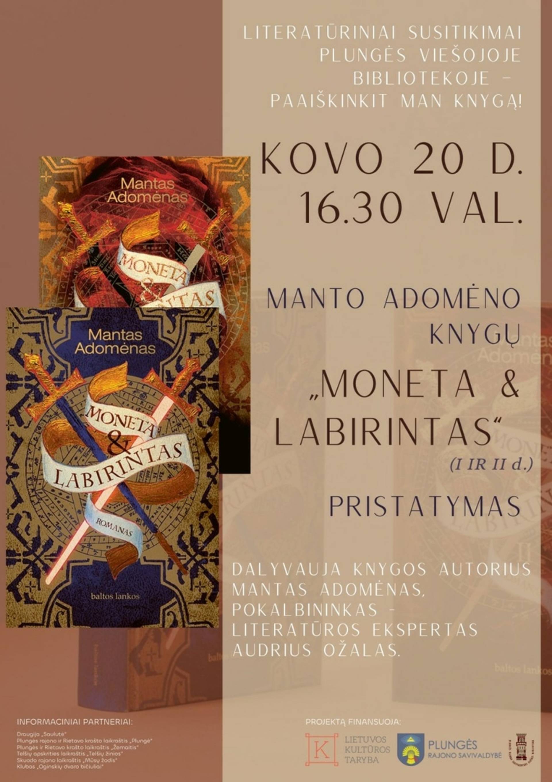 Na, o projektą pradės kovo 20 d. susitikimu su Mantu Adomėnu ir jo knygų „Moneta & labirintas“ (I ir II dalys) pristatymu. M. Adomėnas (g. 1972) – Vilniaus universiteto klasikinės filologijos studijų absolventas, Kembridžo universiteto filosofijos mokslų daktaras, politikas. Pasak R. Drazdauskienės, LRT laidos „Nenušaunami siužetai“ bendraautorės, „ Mantas Adomėnas parašė ne paprastą detektyvą ar šnipų romaną <...>. Tai didžiulis, erdvus, daugialypis ir daugiasluoksnis pasaulis“. „Moneta & Labirintas“ – tikrai knyga-įvykis Lietuvoje, – teigia ir žurnalistas, knygų apžvalgininkas, literatūros ekspertas ir būsimas renginio Plungėje svečias, knygos autoriaus pokalbininkas Audrius Ožalas.
