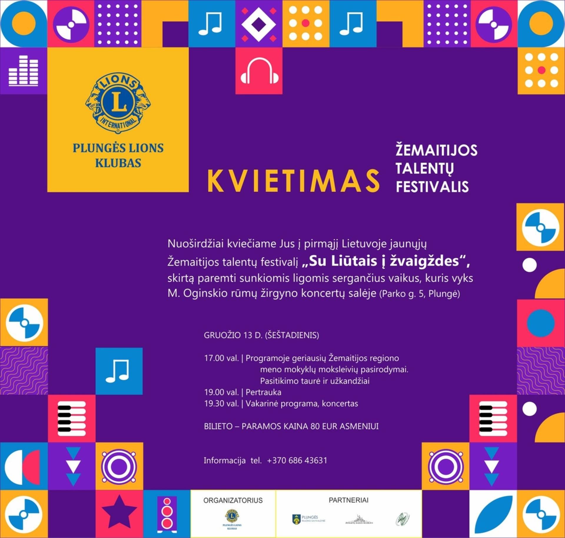 Plungės LIONS klubas kviečia į Plungės M. Oginskių rūmuose vyksiantį Pirmąjį jaunųjų Žemaitijos talentų festivalį.